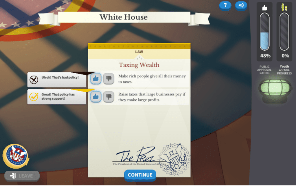 In this example down below, I had to read policies to see if they were good enough to pass into law. The example I am about to show describes Gee’s idea of being pleasantly frustrated while playing a game. I was given two policies to look over. For the first policy, I was about to hit the thumbs down button, but I changed my mind to see what would happen. When I went to sign the bill, I was told that the specific policy I agreed with wasn’t a good choice, and I lost public approval.